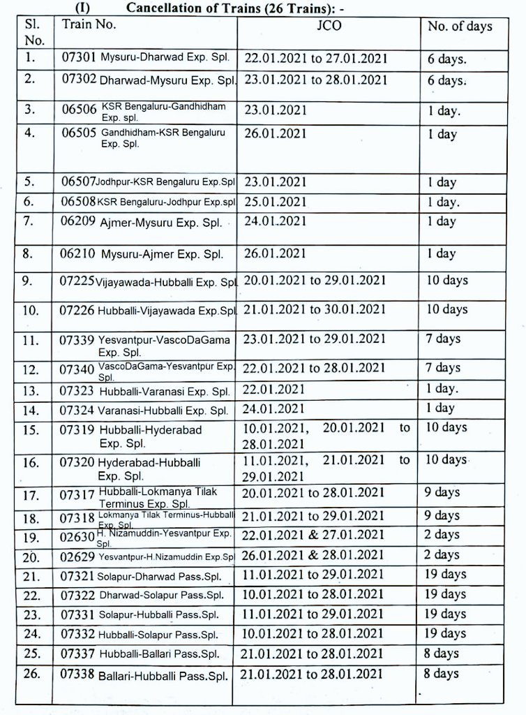 दक्षिण पश्चिम रेल के श्री सिद्धरूढ़ स्वामीजी हुबली स्टेशन के रेलवे यार्ड रिमॉडलिंग का काम शुरू किया गया है अतः निम्नलिखित गाड़ियाँ रद्द की जा रही है। यात्रिओंसे निवेदन है, कृपया अपनी रेल यात्राओंका नियोजन सुव्यवस्थित करें।