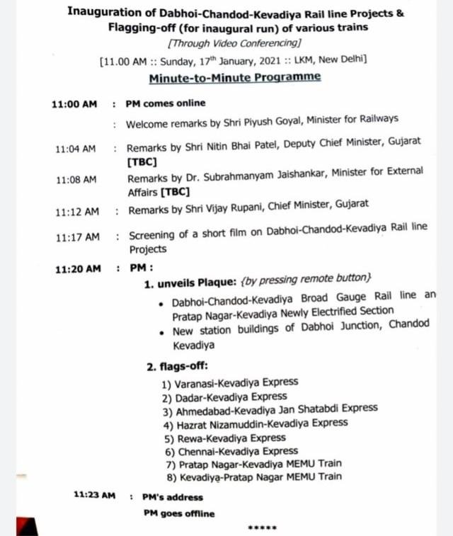 अब तक केवड़िया मे रेल सम्पर्क नही था, लेकिन पश्चिम रेलवे के वडोदरा मण्डल के अथक प्रयासोंने और हमारे प्रधानमंत्री जी की प्रेरणा से यह काम सम्पन्न हुवा है। दिनांक 17 को प्रधानमंत्री इस रेल लाईन को देश को समर्पित करने जा रहे है। इसके साथ ही 6 जोड़ी रेल गाड़ियाँ अब सीधे केवड़िया से चलेगी।