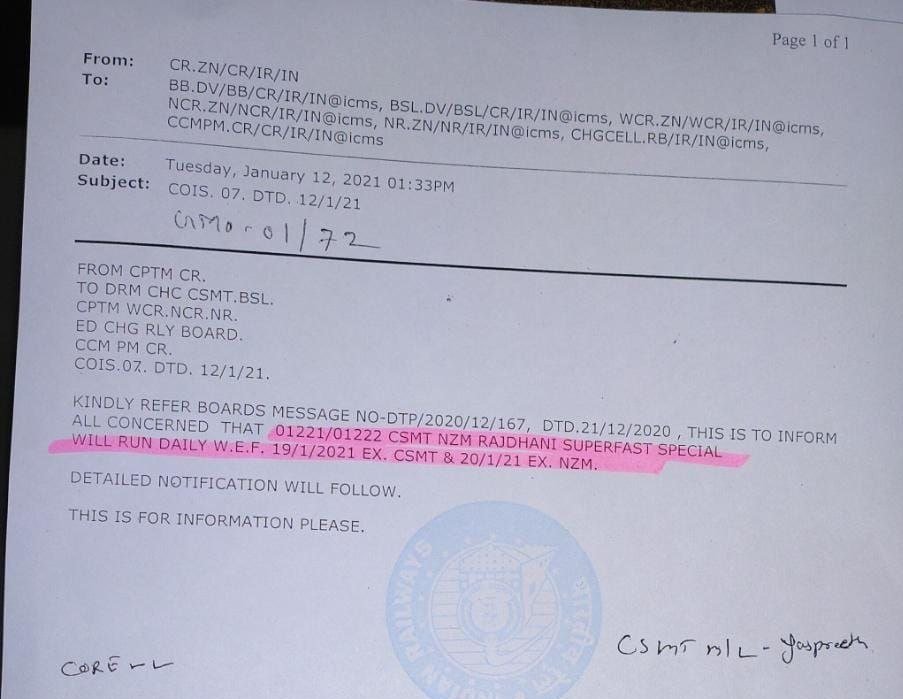 मध्य रेलवे के राजधानी को प्रतिदिन चलाने के लिए हरी झंडी मिल चुकी है। 01221 मुम्बई से 19 जनवरीसे और 01222 हज़रत निजामुद्दीन से 20 जनवरीसे प्रतिदिन चलेगी।