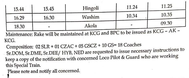 काचेगुड़ा से अकोला होते हुए नरखेड़ जाने वाली छह दिवसीय इण्टरसिटी और अकोला की साप्ताहिक गाड़ी बीच के दिनोंमें अचानक द म रेल प्रशासन ने बन्द कर दी गयी थी। यह तो हिंगोली, वाशिम और नान्देड के रेल प्रेमी कार्यकर्ताओं ने जम कर दबाव बनाया और वह काम भी कर गया। दिनांक 14 जनवरीसे यह गाड़ियाँ फिरसे यात्री सेवा में हाजिर हो रही है।