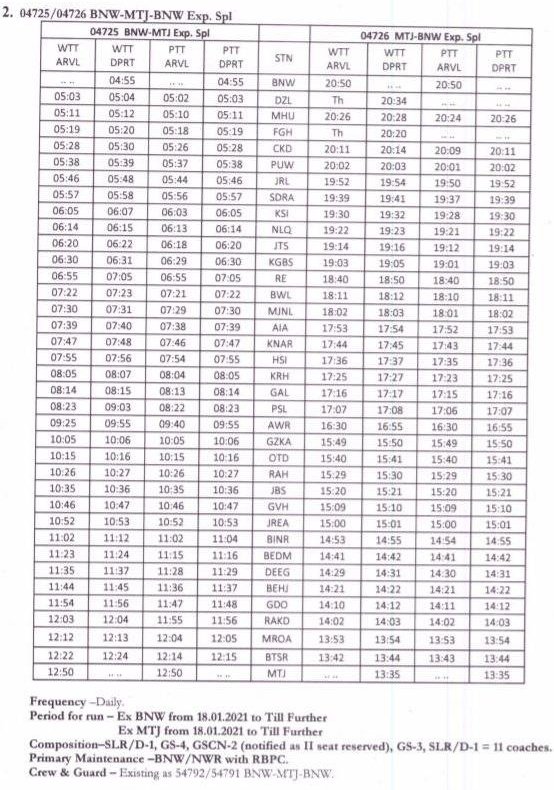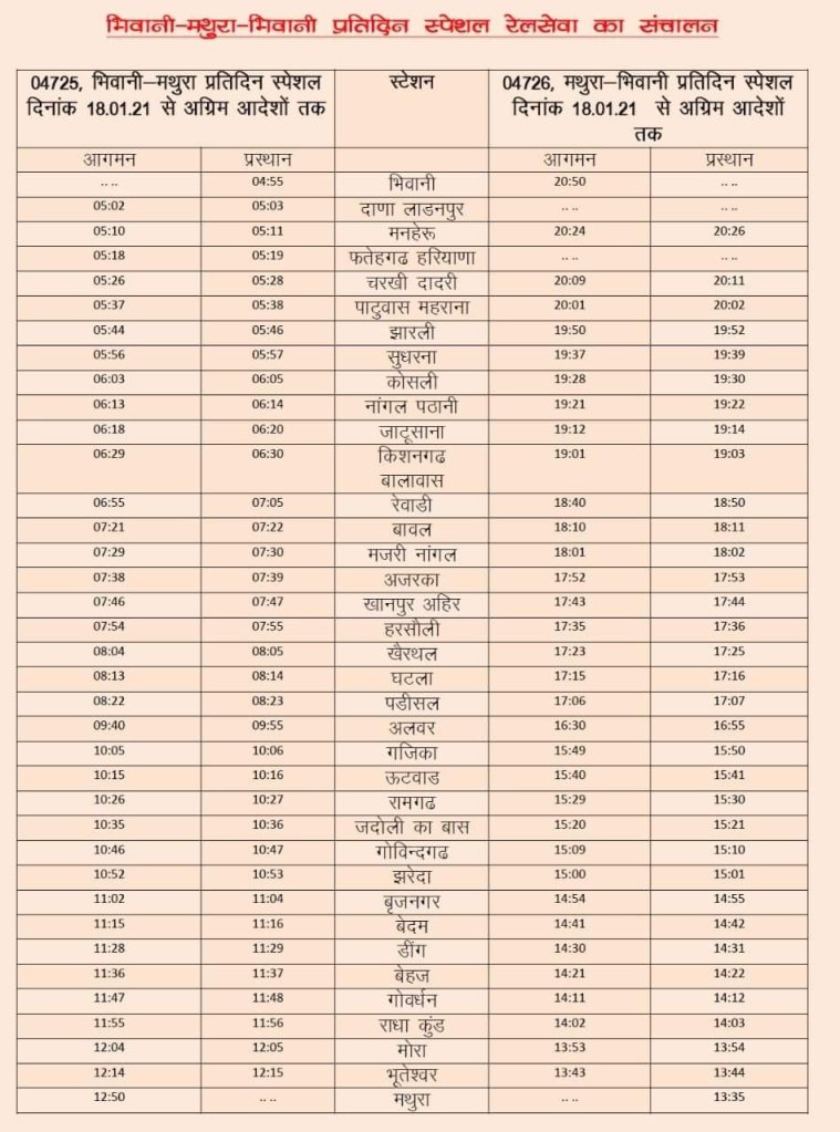 04725/26 भिवानी मथुरा भिवानी प्रतिदिन स्पेशल, जी, 54792/54791 भिवानी मथुरा सवारी गाड़ी का एक्सप्रेस में रूपांतरण, दोनों ओरसे दिनांक 18 जनवरीसे शुरू हो रही है।