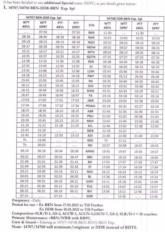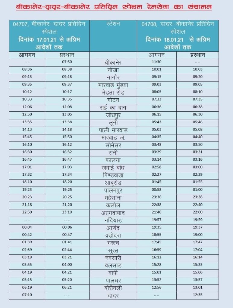 04707/08 बीकानेर दादर बीकानेर रणकपुर स्पेशल प्रतिदिन दिनांक 17/18 जनवरीसे शुरू की जा रही है। खास बात यह है, यह गाड़ी अब बांद्रा टर्मिनस के बजाय दादर – बीकानेर के बीच चलेगी।