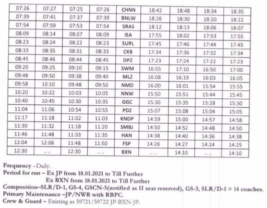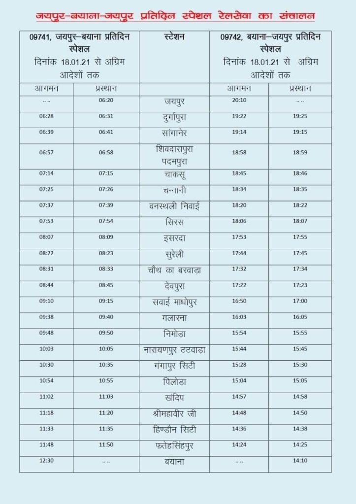 09741/42 जयपुर बयाना जयपुर प्रतिदिन स्पेशल, जी आप ठीक समझे 59721/59722 सवारी गाड़ी का एक्सप्रेस में रूपांतरण, दोनों ओरसे दिनांक 18 जनवरीसे शुरू हो रही है।