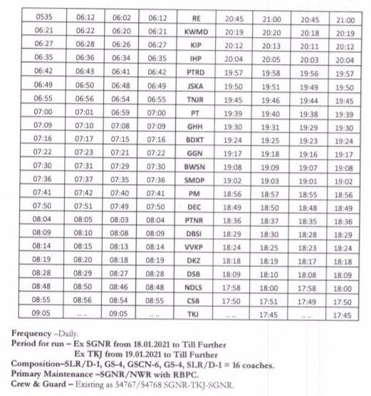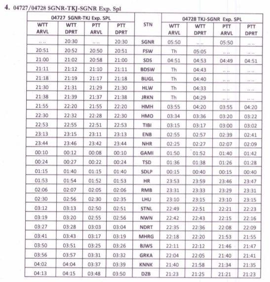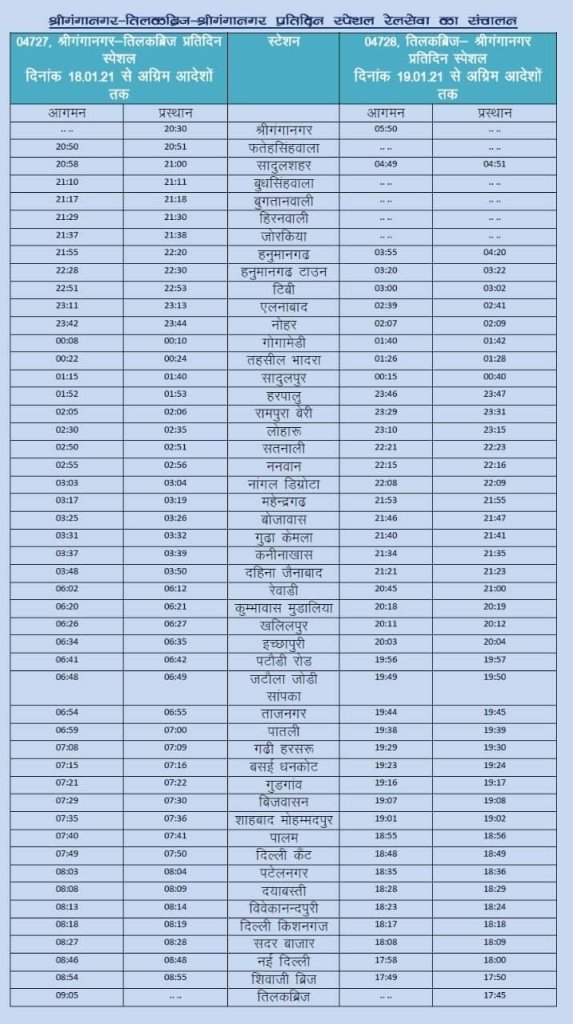 04727/28 श्रीगंगानगर तिलक ब्रिज श्रीगंगानगर प्रतिदिन स्पेशल, यह भी 54767/68 सवारी गाड़ी का ही एक्सप्रेस रूपांतरण है, दिनांक 18/19 से शुरू की जा रही है।