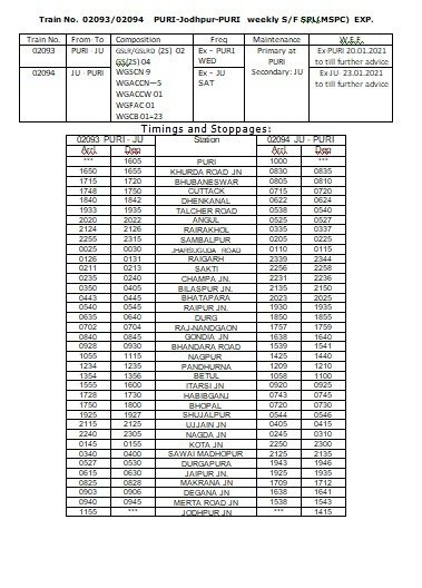 02093/02094 पूरी जोधपुर पूरी साप्ताहिक स्पेशल पूरी से 20 जनवरी एवं जोधपुर से 23 जनवरीसे शुरू की जा रही है।