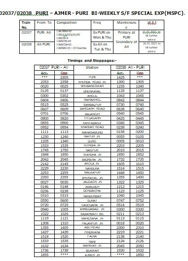 02037/02038 पूरी अजमेर पूरी द्विसाप्ताहिक स्पेशल पूरी से 21 और अजमेर से दिनांक 26 से शुरू होने जा रही है।