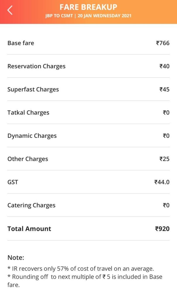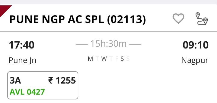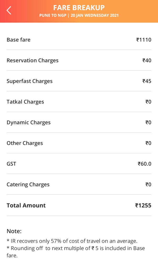 मगर 02113/14 पुणे नागपुर पुणे गरीबरथ का किराया देखिए। पुणे से नागपुर का अंतर है 891 किलोमीटर, बेस किराए 1110 रुपए अन्य चार्जेस मिलाकर कुल किराया 1255 रुपए। यदि इस किरायोंको गरीबरथ के बेस किराए से कलक्युलेट किया जाए तो 717 रुपए ही लगेंगे। अन्य चार्जेस में 40 रुपये आरक्षण, 45 रुपये सुपरफास्ट और gst के 40 रुपये कुल योग हुवा 845 रुपए मात्र और मध्य रेलवे वसूल रही है 1255 यानी 410 रुपए ज्यादा। बताइए यह कौनसा न्याय है?
