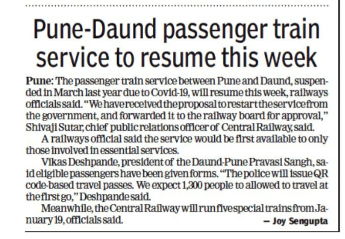 गत 10 महीनोंसे बन्द सवारी गाड़ियोंके बाद अब दौंड पुणे के बीच शुरू किए जाने के आसार है। आपको ज्ञात होगा पुणे दौंड यात्री संगठन ने इन डेमू, मेमू गाड़ियोंको शुरू करने हेतु, 20 जनवरीसे रेल रोको आंदोलन की चेतावनी जारी की थी।