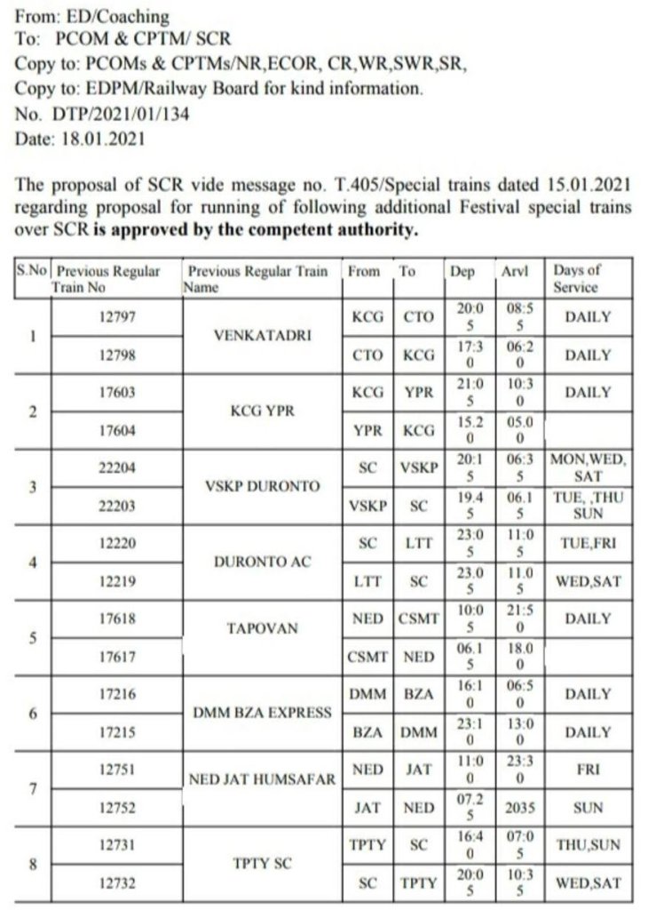 दक्षिण मध्य रेलवे को रेलवे बोर्ड की तरफ से 23 जोड़ी यात्री रेल गाड़ियाँ त्यौहार विशेष श्रेणी में शुरू करने के लिए हरी झंडी दे दी गयी है। जल्द ही इन गाड़ियोंकी घोषणा, उनके नए गाड़ी क्रमांक एवं समयसारणी के साथ की जाएगी। यात्रिओंकी बेहतर कनेक्टिविटी के लिए यह सेवाएं शुरू करने का निर्णय लिया गया है।