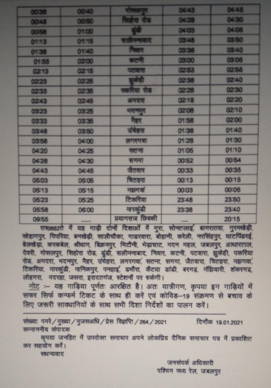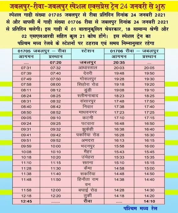 01705/06जबलपुर रीवा जबलपुर स्पेशल 24 जनवरीसे शुरू