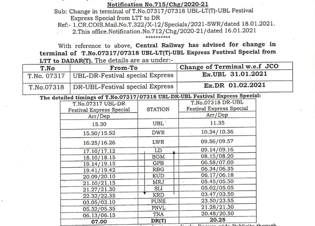 07317/18 श्री सिद्धरूढ़ स्वामीजी हुब्बाली से लोकमान्य तिलक टर्मिनस के बीच चलनेवाली स्पेशल का टर्मिनल स्टेशन बदल रहा है। यह गाड़ी दिनांक 31 जनवरीसे हुब्बाली से दादर के बीच चलेगी और वापसी में दिनांक 01 फरवरीसे दादर से हुब्बाली के लिए चलेगी।