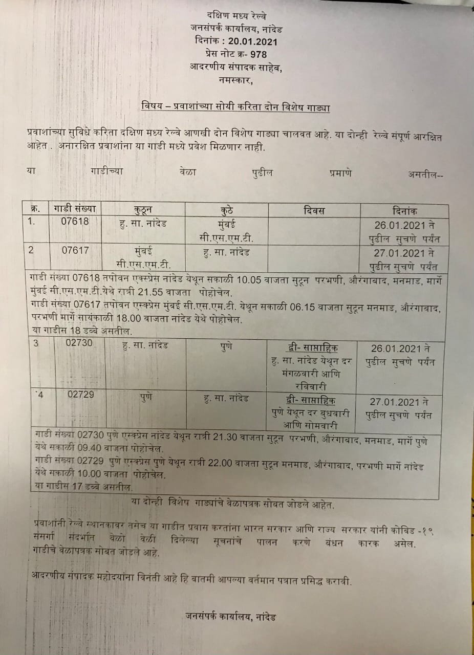 07618/17 हुजूर साहिब नान्देड से छत्रपति शिवाजी महाराज टर्मिनस के बीच प्रतिदिन स्पेशल 26/27 से चल पड़ेगी। साथ ही 02730/29 हुजूर साहिब नान्देड और पुणे के बीच द्विसाप्ताहिक एक्सप्रेस भी उसी दी 26/27 जनवरीसे चलने वाली है।