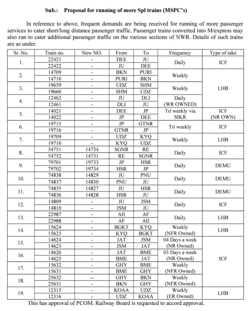 चलिए जानते है, कौनसी है वह 19 जोड़ी गाड़ियाँ जिनके शुरू करने के लिए NWR को सम्मति मिली है।