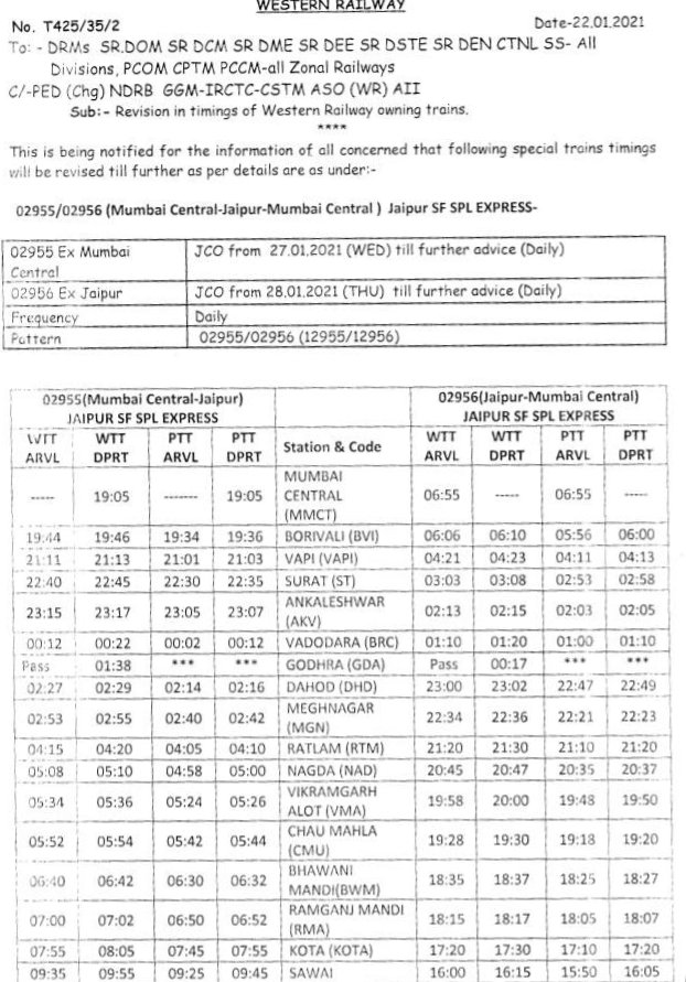 4: 02955 मुम्बई सेंट्रल से दिनांक 27 जनवरीसे और 02956 दिनांक 28 जनवरीसे रोजाना चलेगी।