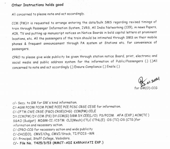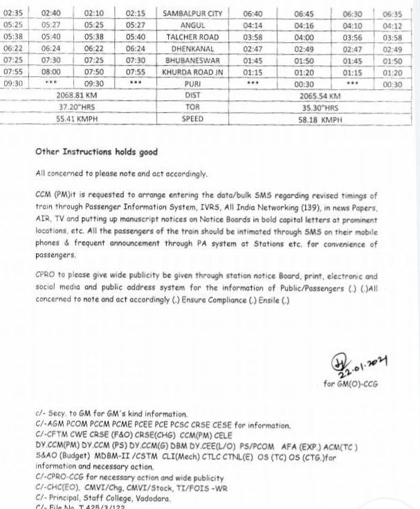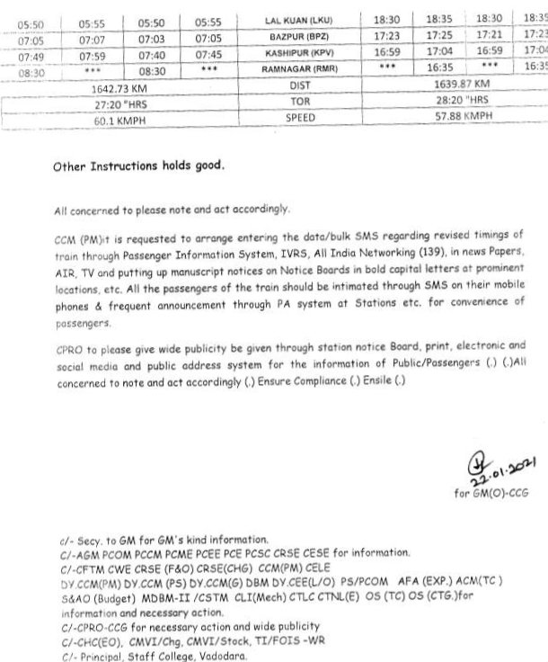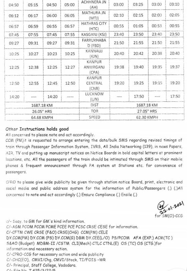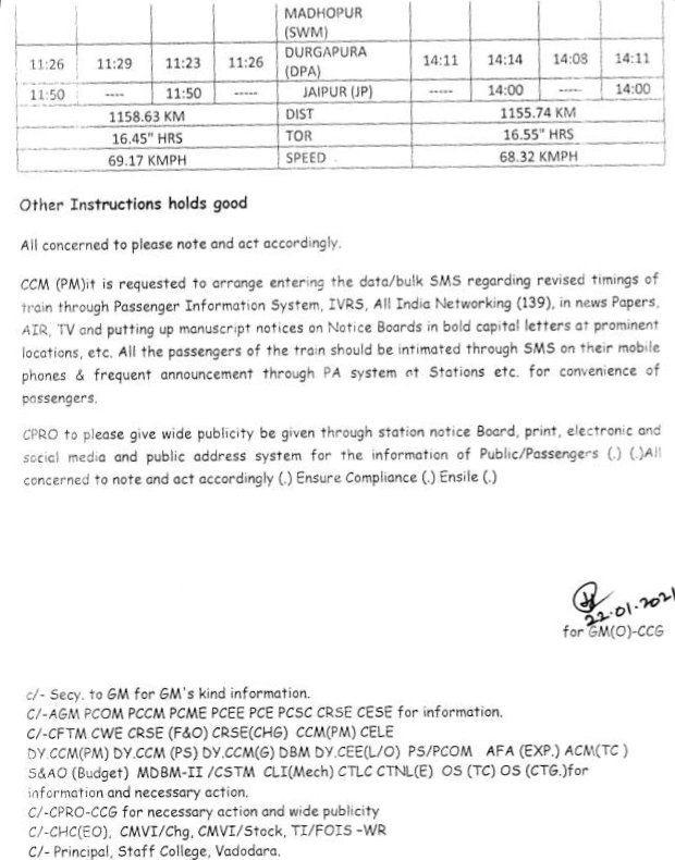 प्रत्येक गाड़ी का परीपत्रक खबर के नीचे जोड़ा गया है, यात्रीगण कृपया सारी सूचनाओंको यथायोग्य पढ़कर अपनी रेल यात्रा का नियोजन करे।