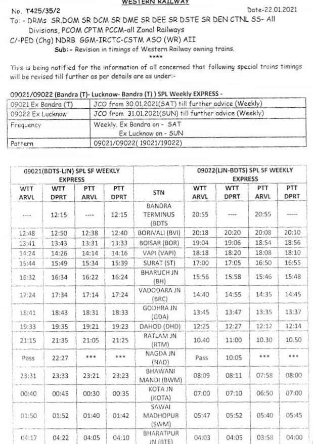 2: 09231 बांद्रा टर्मिनस से दिनांक 30 जनवरीसे हर शनिवार को लखनऊ के लिए चलेगी और वापसीमे 09032 लखनऊ से दिनांक 31 जनवरीसे हर रविवार को बांद्रा के लिए निकलेगी।