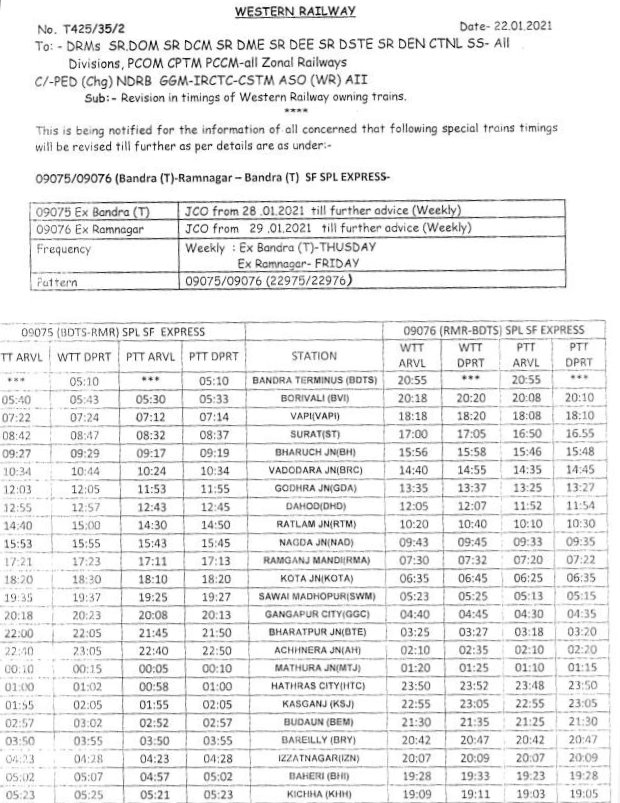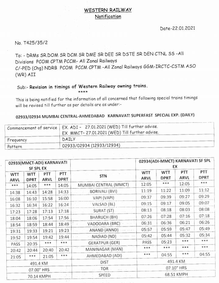5: 02933/34 मुम्बई सेंट्रल अहमदाबाद कर्णावती स्पेशल दोनों ओरसे दिनांक 27 जनवरीसे प्रतिदिन चलेगी।