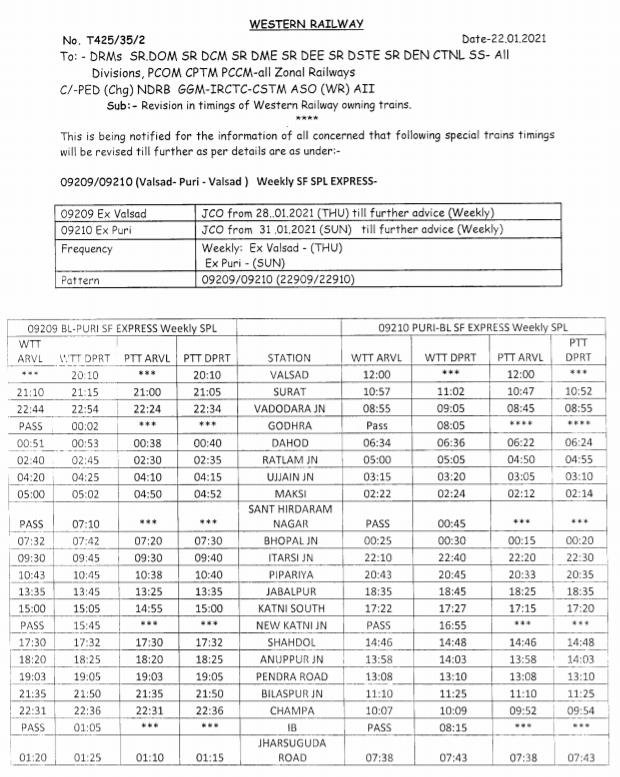 1: 09207 वलसाड पुरी दिनांक 28 जनवरीसे हर गुरुवार को वलसाड से चलेगी। वापसी में 09210 पुरी वलसाड दिनांक 31 जनवरीसे हर शनिवार को पुरी से चलेगी।