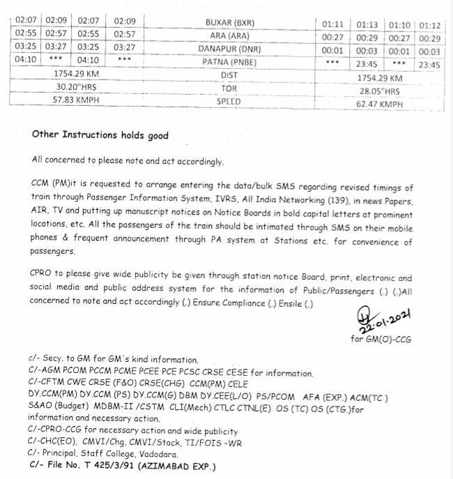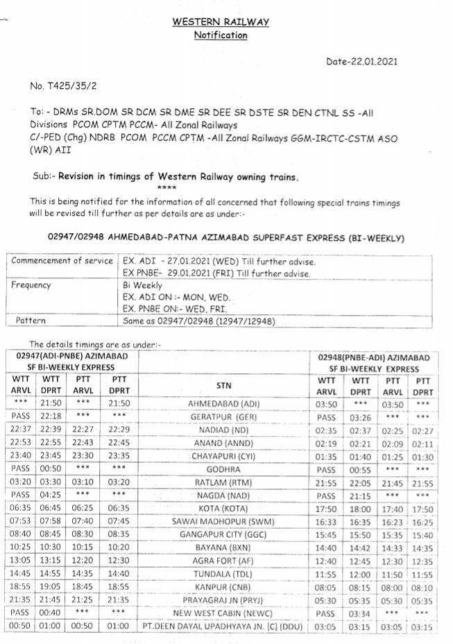 6: 02947/48 अजीमाबाद स्पेशल, 02947 अहमदाबाद से दिनांक 27 जनवरीसे से हर बुधवार और सोमवार को पटना के द्विसाप्ताहिक चलेगी और वापसीमे 02948 पटना से दिनांक 29 जनवरीसे हर शुक्रवार और बुधवार को अहमदाबाद के लिए सप्ताह में दो दिन चलेगी।
