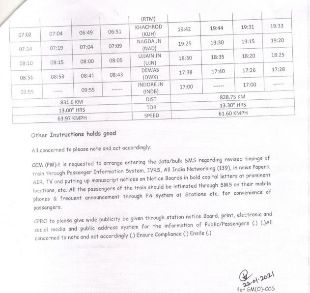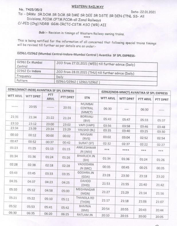 7: 02961/62 मुम्बई इन्दौर मुम्बई अवंतिका स्पेशल, 02961 मुम्बई सेंट्रल से दिनांक 27 जनवरीसे और 02962 इन्दौर से दिनांक 28 जनवरीसे प्रतिदिन अपने बदले समयोंनुसार चलेगी।