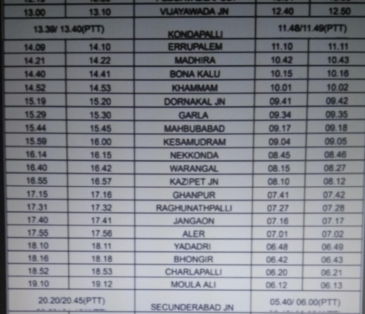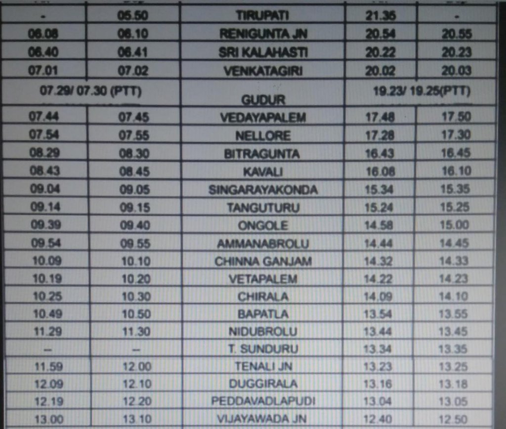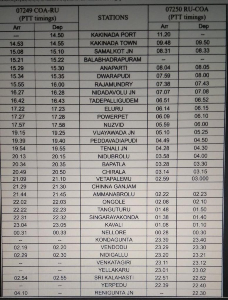 07249/50 काकीनाड़ा पोर्ट रेनिगुंटा काकीनाड़ा पोर्ट स्पेशल दिनांक 27 जनवरीसे, दोनों ओरसे चलेगी। गाड़ी के पुराने समयसारणी के मुकाबले नई समयसारणी में 27 स्टेशनोंके ठहराव हटाए गए है।
