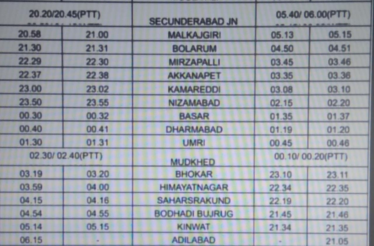 07405 तिरुपति आदिलाबाद दिनांक 28 से प्रतिदिन शुरू होने जा रही है, वही वापसीमे 07406 आदिलाबाद से तिरुपति के लिए दिनांक 29 जनवरीसे शुरू की जाएगी। निम्नलिखित समयसारणी पर यात्रीगण गौर करे, थोड़ा बदलाव किया गया है।