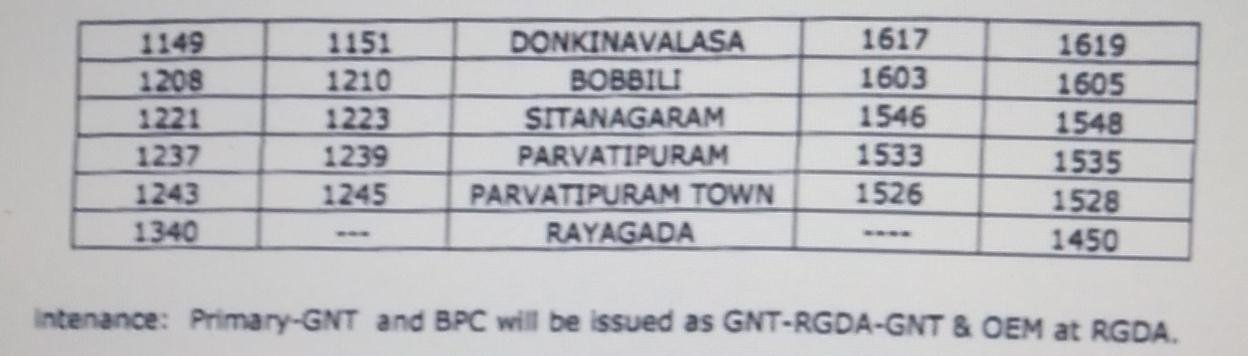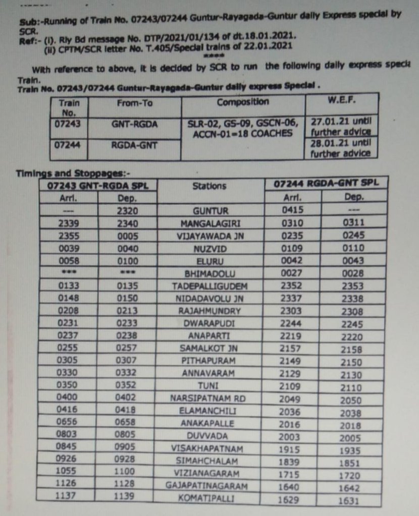 07243 गुण्टूर रायागड़ा स्पेशल दिनांक 27 और 07244 रायागड़ा गुण्टूर स्पेशल दिनांक 28 जनवरीसे प्रतिदिन शुरू की जा रही है। गाड़ी को स्पीड अप किया गया है।
