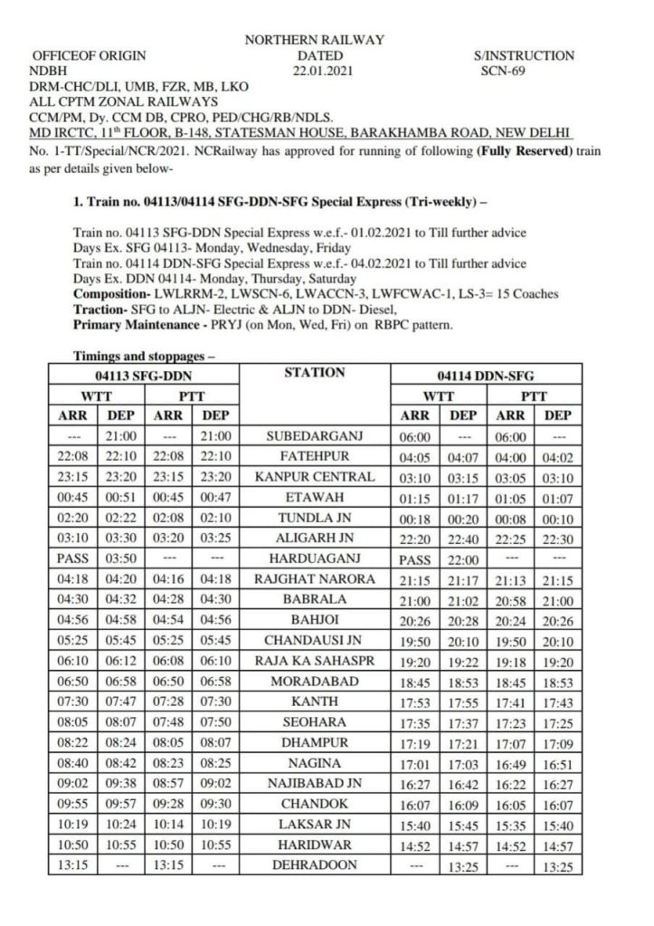 04113 सूबेदारगंज देहरादून स्पेशल दिनांक 01 फरवरी से हर सोमवार, बुधवार और शुक्रवार को चलेगी और वापसीमे 04114 देहरादून सूबेदारगंज स्पेशल दिनांक 04 फरवरी से है सोमवार, गुरुवार और शनिवार को निकलेगी।