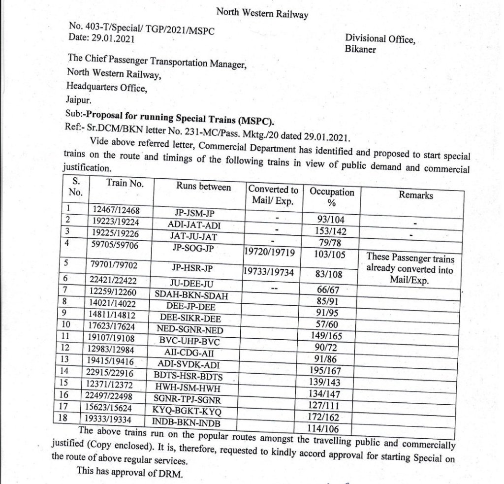 यूँ तो कई सारी गाड़ियाँ उत्तर पश्चिम रेलवे ने शुरू कर दी है, यहाँतक की सवारी की एक्सप्रेस में परावर्तित गाड़ियाँ भी लॉन्च हो गयी है, फिर भी काफी लोकप्रिय गाड़ियोंकी मांग यात्रिओंसे की जा रही थी जिन्हें रेलवे ने शुरू नही किया था। अब स्थानीय रेलवे अधिकारियों ने उन गाड़ियोंकी सूची बनाकर उच्च अधिकारियों के पास भेजी है ताकी वह गाड़ियाँ शुरू की जा सके। आइए देखते है, कौनसी गाड़ियाँ है जो जल्द ही शुरू हो सकती है। सूची में उनकी ऑक्यूपेंसी मतलब यात्रिओंकी बुकिंग्जकी मांग भी दी गयी है।