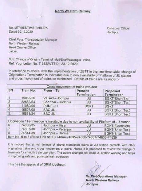 राजस्थान और NWR उत्तर पश्चिम रेल का जोधपुर रेलवे स्टेशन बढ़ती गाड़ियोंके दबाव के चलते बहोत व्यस्त हो गया है। जिसमे कई सारी गाड़ियाँ वहाँपर टर्मिनेट/ ओरिजिनेट होती है। इन खत्म हुई गाड़ियोंको शंटिंग करना, उनका रखरखाव आदी काम जोधपुर स्टेशन की और भी गाड़ियोंके समयपालन में दबाव बनाता है। इसीलिए ज़ीरो टाइमटेबल में 8 जोड़ी गाड़ियोंके टर्मिनल्स को जोधपुर के जगह भगत की कोठी स्टेशनपर किए जाने का प्रस्ताव है।