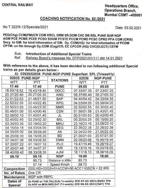 02035 पुणे नागपुर स्पेशल 07 फ़रवरी से प्रत्येक मंगलवार, गुरुवार एवं रविवार को निकलेगी और 02036 नागपुर पुणे स्पेशल 06 फरवरी को प्रत्येक सोमवार, बुधवार एवं शनिवार को चलेगी। यह गाड़ी, 12135/36 पुणे नागपूर पुणे सुपरफास्ट की तरह डिब्बा संरचना और स्टापेजेस लेगी। निम्नलिखित समयसारणी पर ध्यान दीजिएगा, समय मे थोड़ा बदलाव है।