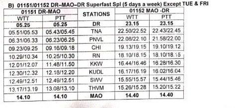 01151/52 दादर मडगाँव दादर स्पेशल सप्ताह में पांच दिन चलेगी। यह गाड़ी प्रत्येक मंगलवार, गुरुवार, शुक्रवार, शनिवार एवं रविवार को दोनोंही दिशासे चलेगी।