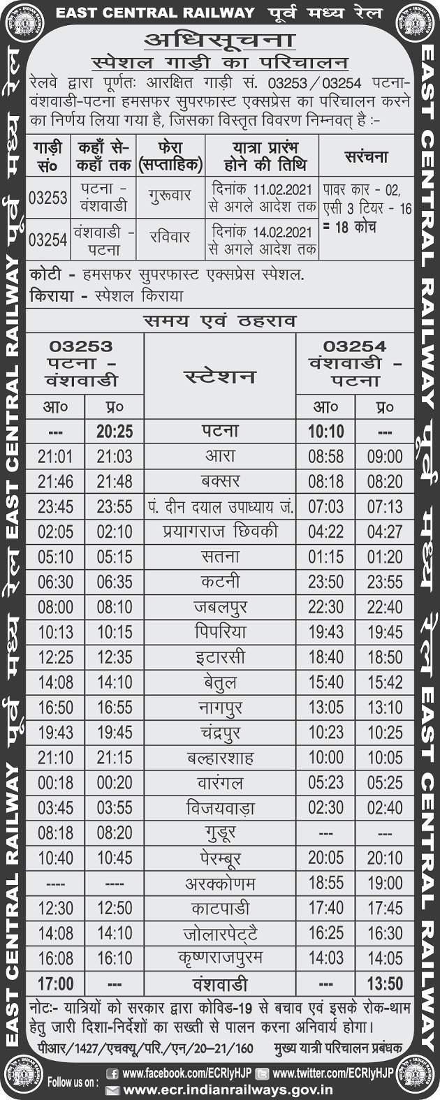22353/54 पटना बनासवाड़ी पटना साप्ताहिक हमसफ़र दोबारा अपना सफर शुरू करने जा रही है। गाड़ी क्रमांक बदलकर 03253/54 हो गया है और गाड़ी अब तिरुपति/रेनिगुंटा होकर न जाते हुए चेन्नई के उपनगर पैरमबुर होकर जाएगी। साथ ही गाड़ी के समय मे भी व्यापक बदलाव हुवा है।