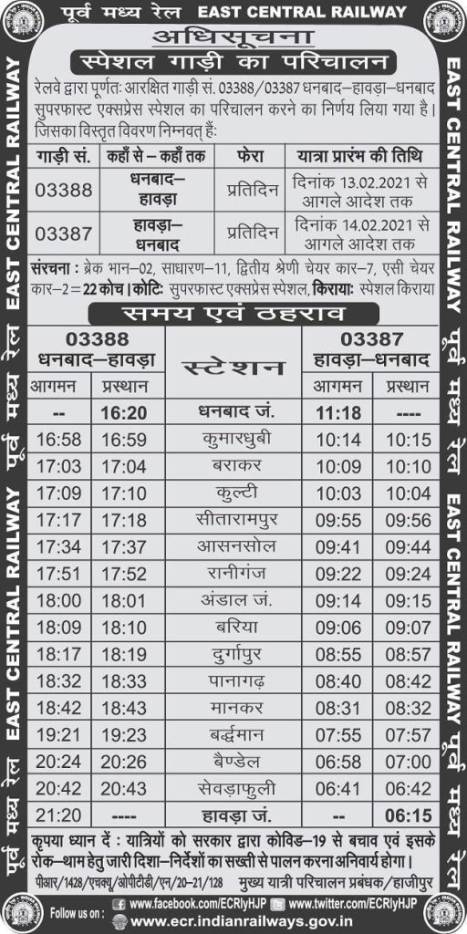 22388/87 धनबाद हावडा धनबाद ब्लैक डायमण्ड एक्सप्रेस प्रतिदिन स्पेशल श्रेणी में 03388/87 क्रमांक से प्रतिदिन धनबाद से 13 और हावडा से 14 फ़रवरी को चलना शुरू हो जाएगी।