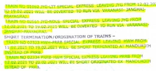 02333 हावड़ा प्रयागराज रामबाग विभूति स्पेशल, जो हावड़ा से 11 से 19 फरवरी तक प्रतिदिन निकलेगी उसे मंडुआडीह स्टेशनपर समाप्त कर दिया जाएगा। यह गाड़ी मंडुआडीह से आगे प्रयागराज रामबाग के बीच रद्द रहेगी।