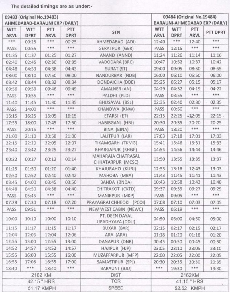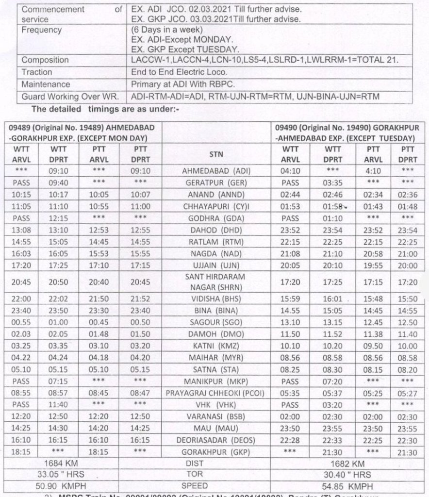 इसमें 09083/84 अहमदाबाद मुजफ्फरपुर अहमदाबाद स्पेशल का गाड़ी क्रमांक बदल 09483/84 कर उसे बरौनी तक विस्तारित किया गया, मार्ग इटारसी से आगे जबलपुर होते हुए न जाकर हबीबगंज, बीना, खजुराहो होकर मानिकपुर से आगे चलाया जाएगा। उसी प्रकार 09089/90 अहमदाबाद गोरखपुर अहमदाबाद प्रतिदिन स्पेशल का गाड़ी क्रमांक 09489/90 कर उसे भुसावल, इटारसी, जबलपुर के बजाय, सप्ताह में 6 दिन, रतलाम, उज्जैन, सन्त हिरदाराम नगर, बीना, सागर, दमोह होकर कटनी से आगे चलाया जाएगा।
