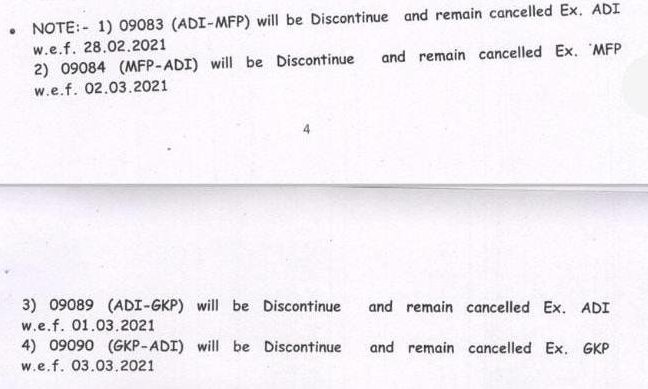 कल पश्चिम रेलवे का एक परीपत्रक अकस्मात वायरल हुवा। परीपत्रक में 09083/84 अहमदाबाद मुजफ्फरपुर अहमदाबाद प्रतिदिन वाया सूरत, भुसावल, इटारसी और 09089/90 अहमदाबाद गोरखपुर अहमदाबाद प्रतिदिन वाया सूरत, भुसावल, इटारसी को मध्य रेलवे के मार्ग से, 1 मार्च से बन्द कर पश्चिम रेलवे के मार्ग से चलाने का निर्णय था।