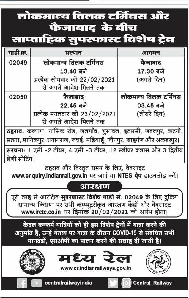 02049 साप्ताहिक सुपरफास्ट स्पेशल लोकमान्य तिलक टर्मिनस से 22.2.2021 से प्रत्येक सोमवार को 13.40 बजे रवाना होगी और अगले दिन 17.30 बजे फैजाबाद पहुंचेगी।
