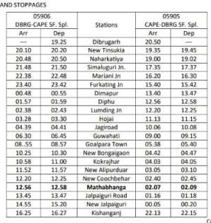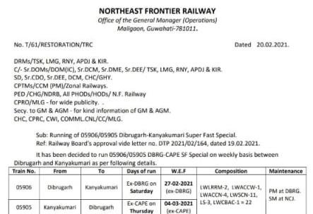 05906 डिब्रूगढ़ कन्याकुमारी विवेक साप्ताहिक विशेष गाड़ी 27 फ़रवरी से प्रत्येक शनिवार को चलेगी और वापसीमे 05905 कन्याकुमारी डिब्रूगढ़ विवेक साप्ताहिक विशेष 04 मार्च से प्रत्येक गुरुवार को निकलेगी। गाड़ी को स्पीड अप किया गया है, समयसारणी में व्यापक बदलाव है।