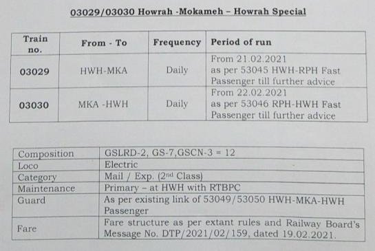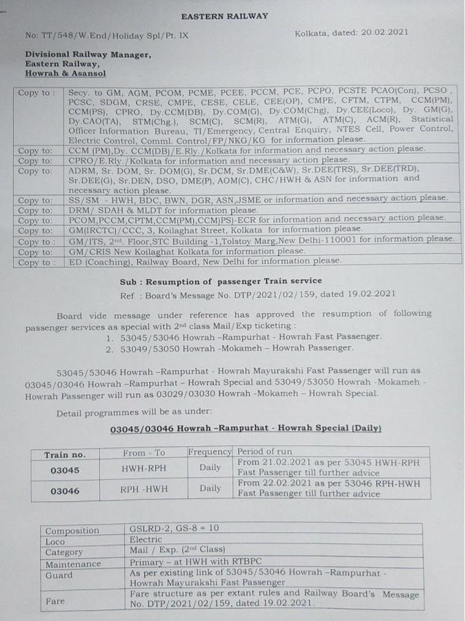 पूर्व रेलवे की दो जोड़ी 53045/46 हावड़ा रामपुरहाट हावडा मयूराक्षी फास्ट पैसेंजर और 53049/50 हावड़ा मोकामा हावड़ा सवारी स्पेशल एक्सप्रेस के रूप में शुरू किया जा रहा है। विस्तृत जानकारी निम्नलिखित परीपत्रक के साथ