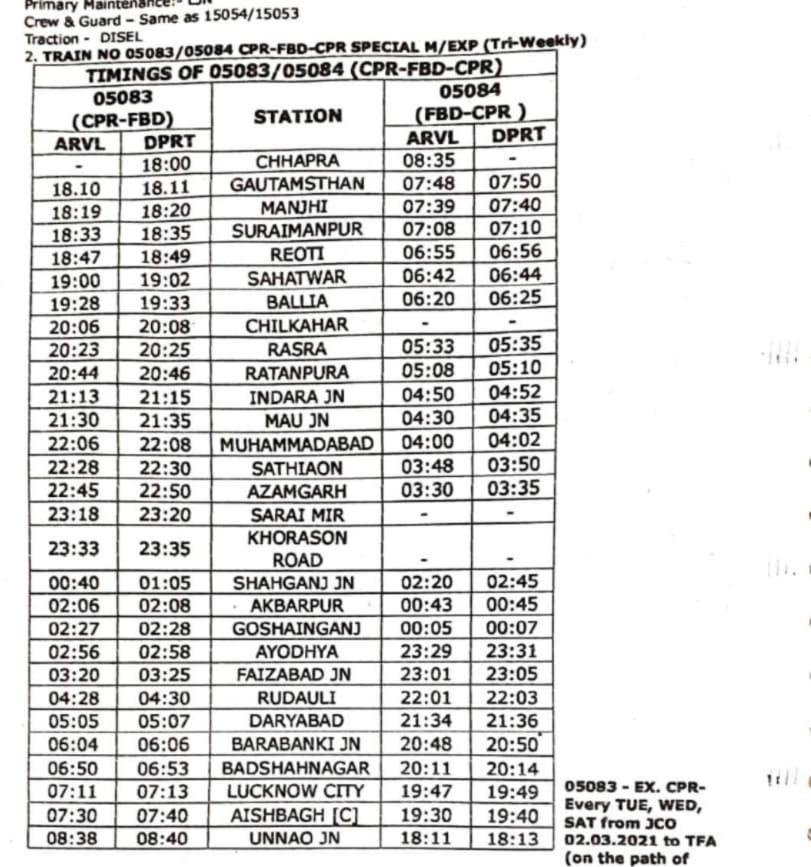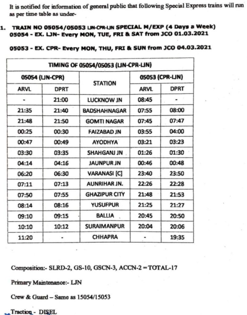 05054 लखनऊ छपरा 01 मार्च से प्रत्येक सोमवार, मंगलवार, शुक्रवार एवं शनिवार को चलेगी और वापसीमे 05053 छपरा लखनऊ विशेष 04 मार्च से प्रत्येक सोमवार, गुरुवार, शुक्रवार एवं रविवार को चलेगी।