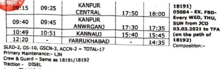 05083 छपरा फर्रूखाबाद उत्सर्ग विशेष त्रिसाप्ताहिक फेरोंमे 02 मार्च से प्रत्येक मंगलवार, बुधवार एवं शनिवार को चलेगी और वापसीमे 05084 फर्रूखाबाद छपरा उत्सर्ग त्रिसाप्ताहिक विशेष 03 मार्च से प्रत्येक बुधवार, गुरुवार एवं रविवार को चलेगी। ज्ञात रहे पूर्व में इस गाड़ी का क्रमांक 18191/92 था और यह प्रतिदिन चला करती थी।