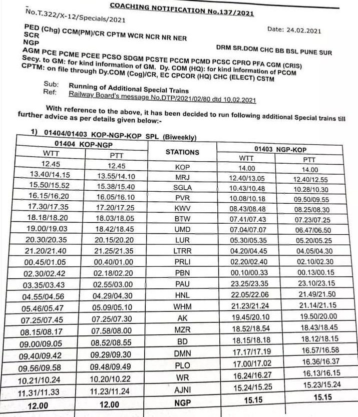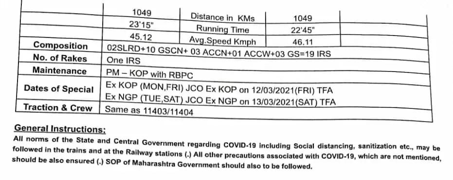 01404 कोल्हापुर से दिनांक 12 मार्च से प्रत्येक शुक्रवार एवं सोमवार को नागपुर के लिए रवाना होगी, वापसी में 01403 नागपुर से दिनांक 13 मार्च से प्रत्येक शनिवार एवं मंगलवार को कोल्हापुर के लिए चलेगी। गाड़ी की संरचना 10 स्लिपर, 3 वातानुकूलित थ्री टियर, 1 वातानुकूलित टू टियर, 3 द्वितीय वर्ग और 2 एसएलआर रहेंगे। उपरोक्त विशेष गाड़ियाँ संक्रमण कालीन सभी एहतियात एवं नियमोंका पालन कर के चलाई जाएगी। साथमे समयसारणी दी जा रही है।