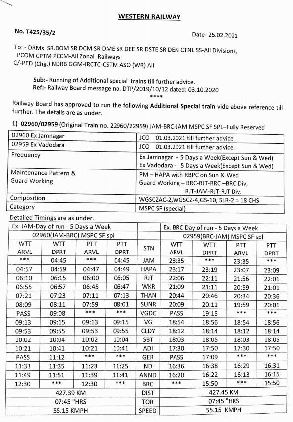 02960/59 जामनगर वडोदरा जामनगर इन्टरसिटी दिनांक 01 मार्च से दोनों ओरसे प्रत्येक सोमवार, मंगलवार, गुरुवार, शुक्रवार एवं शनिवार याने सप्ताह में पाँच दिन चलाई जाएगी। गाड़ी पूर्णतयः आरक्षित आसन व्यवस्थाओंके के साथ चलेगी। केवल कन्फर्म टिकटधारी यात्रिओंको ही इस रेल गाड़ी में यात्रा करने की अनुमति है। आगे समयसारणी दी गयी है।
