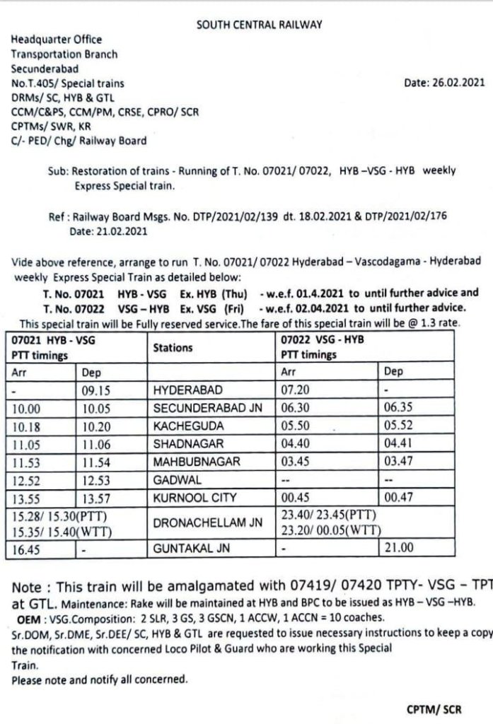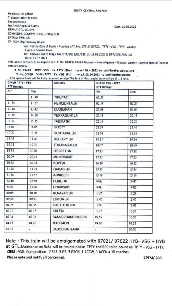 07021/07419 हैदराबाद / तिरुपति वास्को डी गामा स्पेशल दिनांक 01 अप्रैल से प्रत्येक गुरुवार को चलेगी। वापसीमे 07022/07420 वास्को डी गामा तिरुपति / हैदराबाद स्पेशल दिनांक 02 अप्रैल से प्रत्येक शुक्रवार को चलेगी।