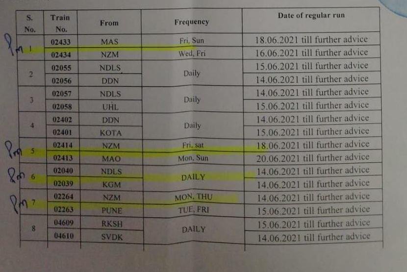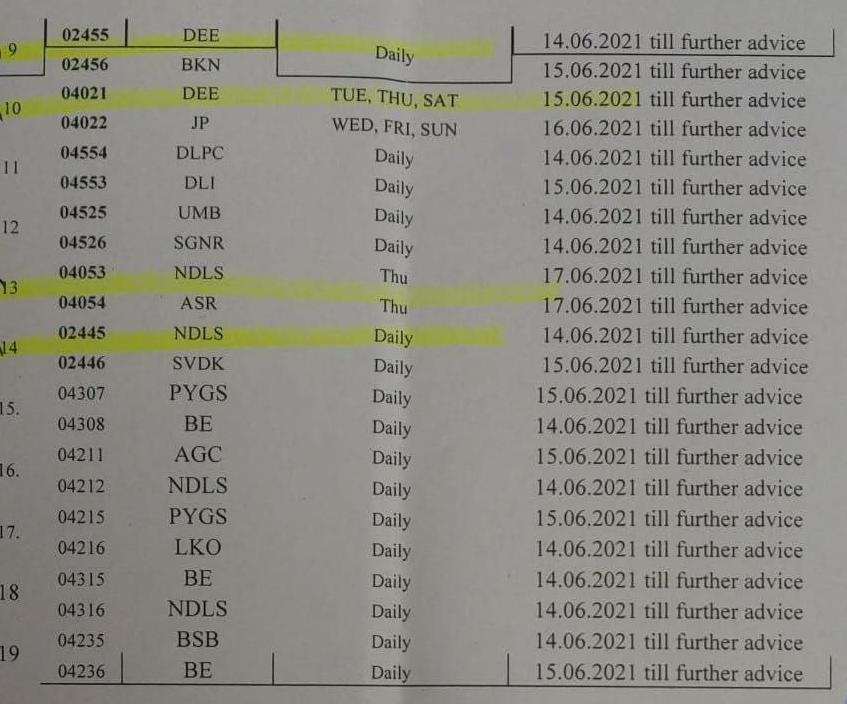 उत्तर रेलवे अपनी 19 जोड़ी गाड़ियाँ निम्नलिखित तारीखोंपर शुरू करने जा रहा है।