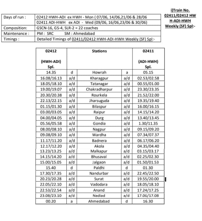 02412 हावडा अहमदाबाद साप्ताहिक दिनांक 07, 14, 21 एवं 28 जून को प्रत्येक सोमवार को हावडा से अहमदाबाद के लिए और 02411 अहमदाबाद हावडा साप्ताहिक 09, 16, 23 एक 30 जून को अहमदाबाद से हावडा के लिए चलेगी।