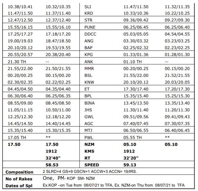 02047/48 कोल्हापुर निजामुद्दीन कोल्हापुर साप्ताहिक विशेष जुलाई से शुरू करने जा रही है। 02047 साप्ताहिक विशेष दिनांक 06/7/2021 से प्रत्येक मंगलवार को कोल्हापुर से सुबह 9:10 को निकलेगी और अगले दिन शाम 17:50 को हजरत निजामुद्दीन को पोहोचेगी। वापसीमे 02048 के समयोंमे काफी परिवर्तन हुवा है, गाड़ी अच्छी स्पीड अप की गई है। 02048 दिनांक 08/7/2021 से, हजरत निजामुद्दीन से प्रत्येक गुरूवार को सुबह 5:10 को निकल अगले दिन दोपहर में 13:30 को कोल्हापुर पोहोचेगी, पहले यह गाड़ी 16:20 को कोल्हापुर पोहोंचती थी।