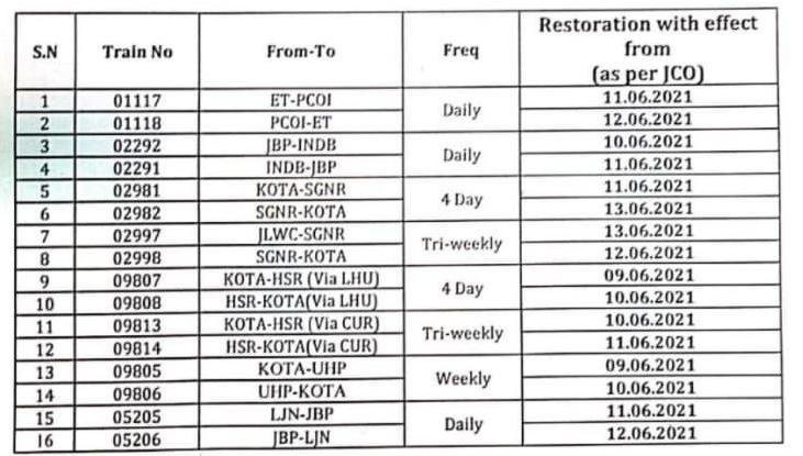 7: 09805 कोटा उधमपुर साप्ताहिक दिनांक 09 जून से प्रत्येक बुधवार को एवं 09806 उधमपुर कोटा साप्ताहिक दिनांक 10 जुनसे प्रत्येक गुरुवार को चलेगी।