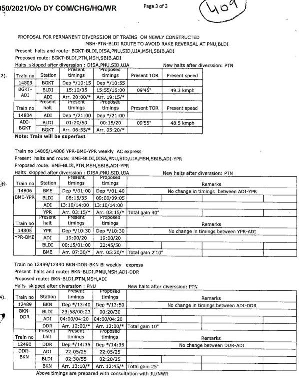 पश्चिम रेलवे का नया मार्ग महेसाणा – पाटण – भीलड़ी पर गाड़ियोंका परिचालन मोड़ा जा रहा है। इसमें 14803/04 भगत की कोठी अहमदाबाद भगत की कोठी साप्ताहिक को इस मार्ग से चलाया जाएगा। समय का व्यापक बदलाव हो रहा है। गाड़ी गन्तव्योंपर जल्द पहुंचेंगी। साथ ही डीसा, पालनपुर, सिद्धपुर और उंझा यह स्टापेजेस जाकर पाटण यह एक स्टापेज अस्तित्व में आ जाएगा। साथ ही गाड़ी को सुपरफास्ट का दर्जा भी दीया जाएगा।